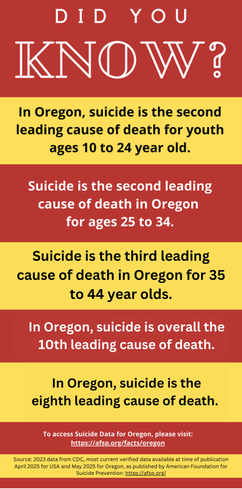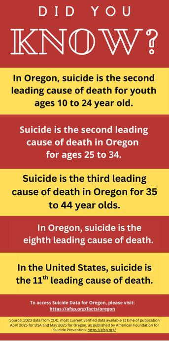 Mental health impacts our quality of life each and every day and impacts our very ability to stay alive. Suicide is a leading cause of death for youth in Oregon. While we all need to work together to improve youth mental health, the voices of youth are especially important. Be sure to read the "Did You Know?" infographic.
